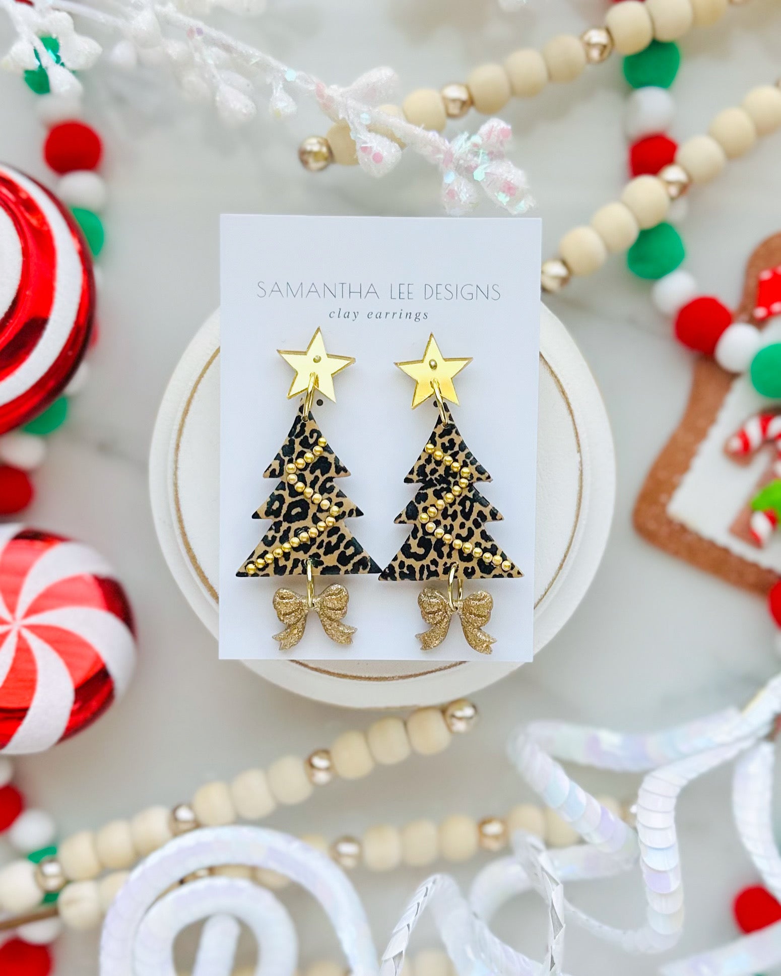 Leopard print Christmas tree with hand placed gold bead garland. Each pair is made to order and print may vary